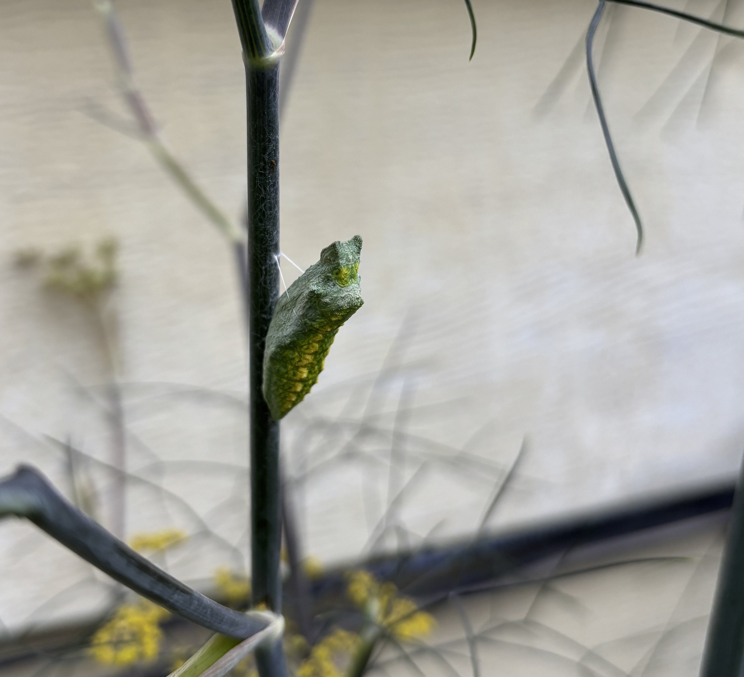 We had one make it to chrysalis! It’s green because it chose a plant stem. They’ll be brown if they end up on a twig or branch. I love their little silk safety belts.