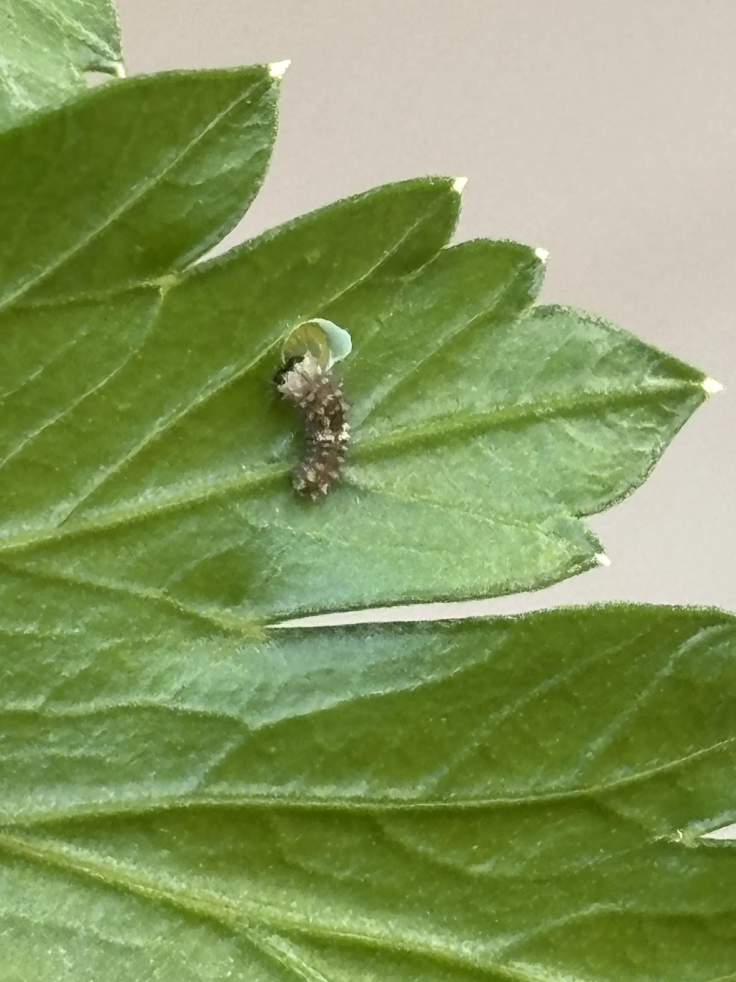 A fresh batch is already hatched. This is a newly hatched caterpillar noshing on its egg on the parsley. This one made it about three days before being carried off.