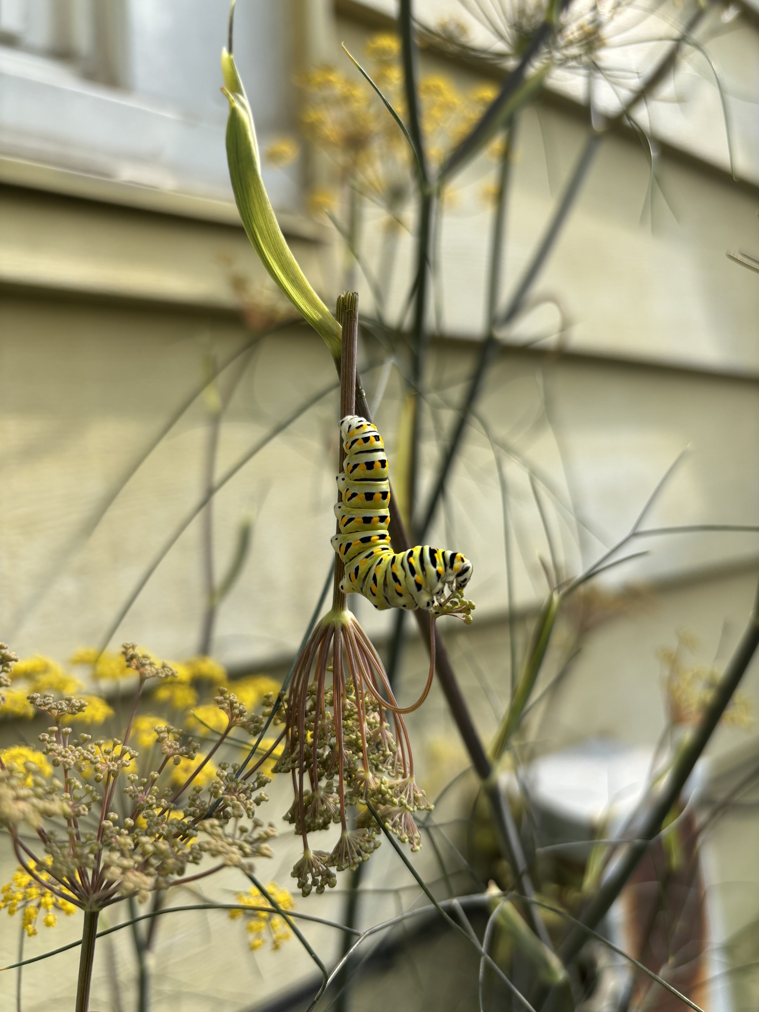 Because the bronze fennel has planted itself by the air conditioner (turns out it loves gravel), the caterpillars on it have a better than average chance of survival. It’s been hot since mid-June, so the AC is on a fair amount, blowing the fennel in a high breeze. This keeps the opportunistic sparrows out of it as it’s too bouncy to land on. The caterpillars don’t seem to mind.